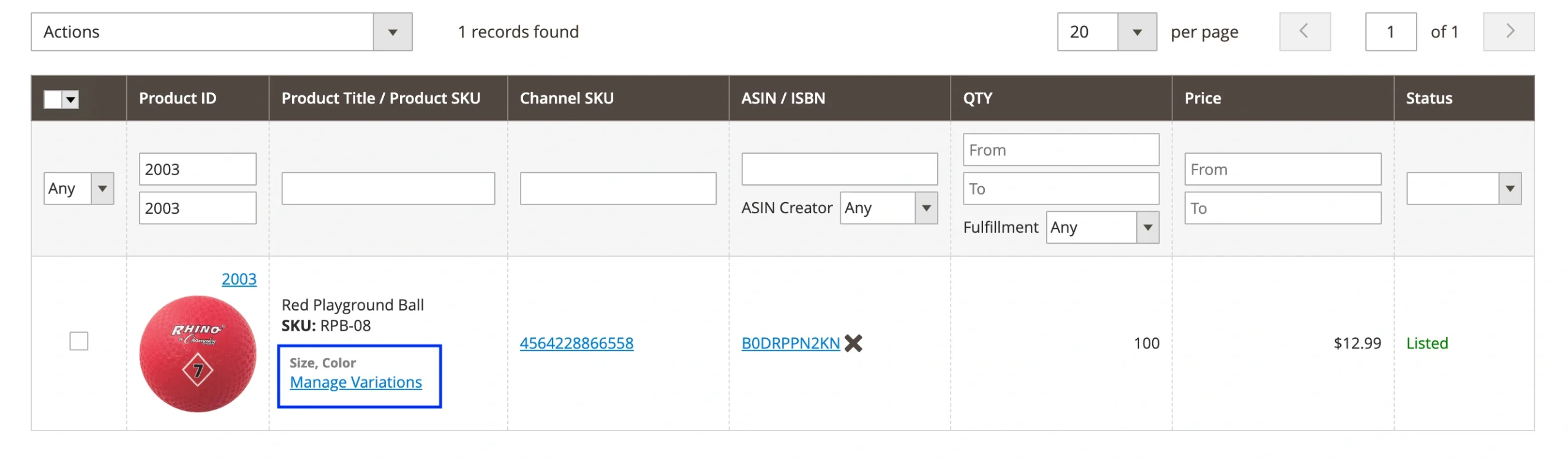 Se você gerencia suas listagens da Amazon através do M2E Pro para Adobe Commerce (Magento), pode revisar e atualizar suas variações sem sair da plataforma. Clique em Gerenciar variações ao lado do produto variacional na página Listagem do M2E Pro. A partir daí, você pode visualizar e gerenciar todas as variações individuais e seus detalhes.